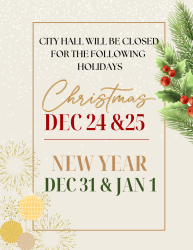 City Hall will be closed for the following holidays: Christmas 12/24 & 12/25 and New Year 12/31 and 1/1/26