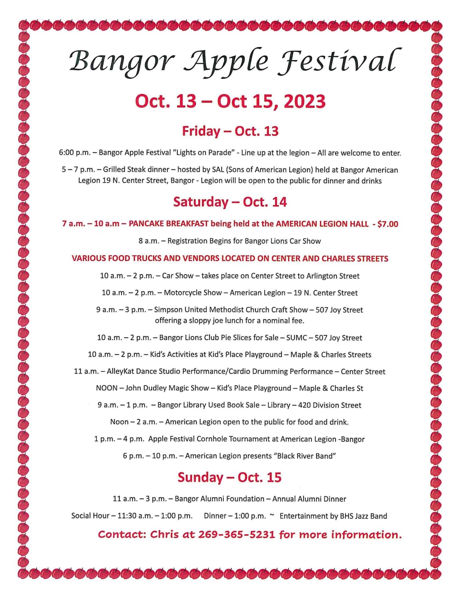 Bring the whole family and join us for the Annual Bangor Apple Festival. Enjoy great food and special events right in downtown Bangor. If you have questions or need any further information, call Chris at 269.365.5231