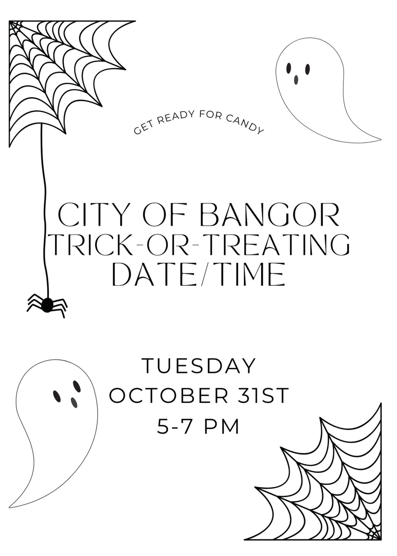 The City Council has voted that the City of Bangor trick-or-treating date and time will be on Tuesday, 10/31 from 5 to 7 PM. Be sure to stop by City Hall.
